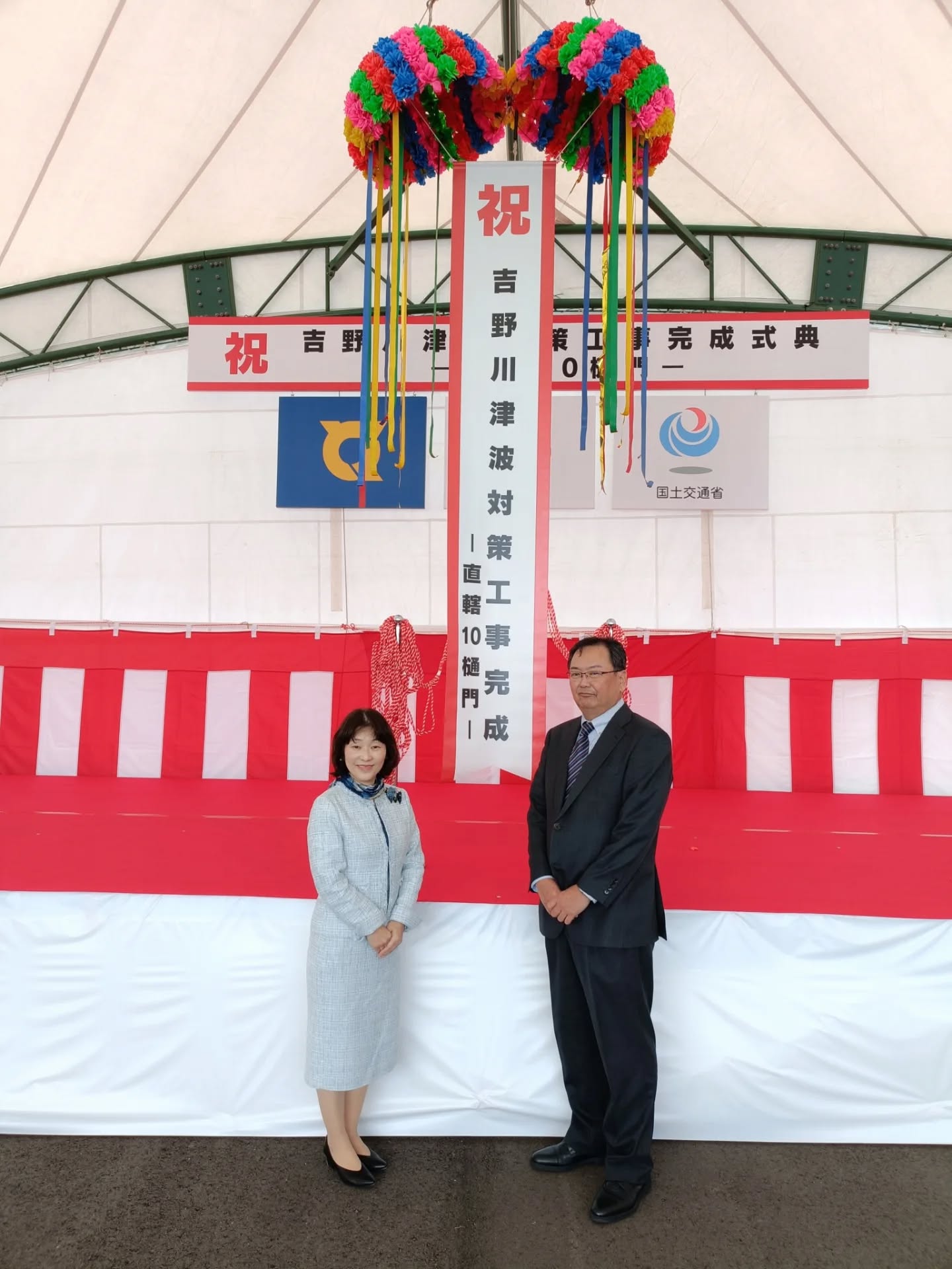 安永徳島河川国道事務所長とも記念撮影できました。 榎瀬川樋門から眺める吉野川の水面と眉山も美しかったです。先週末は吉野川の上流で、そして今週は吉野川の下流で司会を担当させていただき光栄です。ありがとうございます。そして完成おめでとうございます!