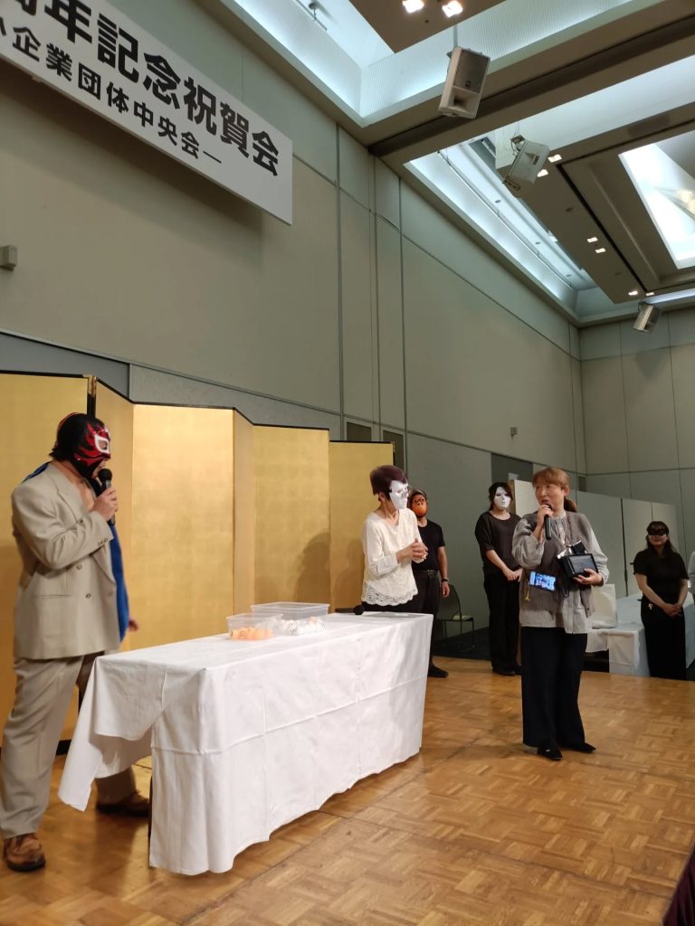 一緒に他の方と写真が撮影できていないのですが、祝賀会では楽しい余興がありました。お楽しみ抽選会では半田手延べそうめん協同組合から北室淳子ちゃん,なんとすてきな藍染めの財布があたってましたよかったね。淳子ちゃん!その様子は撮れました。(他にも豪華プレゼントがたくさんありました)