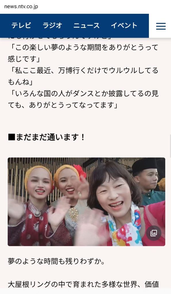 内閣府の世界青年の船事業で出会ったSWY21のナショナルリーダーとして活躍していたイエメンの友人との再会、フラットな会場で車椅子の母をのせて移動しやすい会場。5月末までに入場した人には、通期パスを20%割引で購入できると知りました。友人とも色々話したいし、海外のパビリオンも全部みたい、母も何度か連れてきたいと「えいっ」と通期パスを購入。ここからすべてがはじまりました。徳島県で開催された国際宇宙博ではオープニングセレモニー司会と「宇宙アニメが与えた宇宙業界への影響と宇宙開発の未来」モデレーター(進行役)を担当しました。ガンダムがテーマでした。ガンダムのパビリオンもスマホが壊れそうになりながら予約っ。関西パビリオンの徳島県ゾーンも紹介したいと、3回目の入場で関西パビリオンの予約ができ2時間以上滞在しました。ロータリークラブでも万博の話をさせていただきありがたかったです。