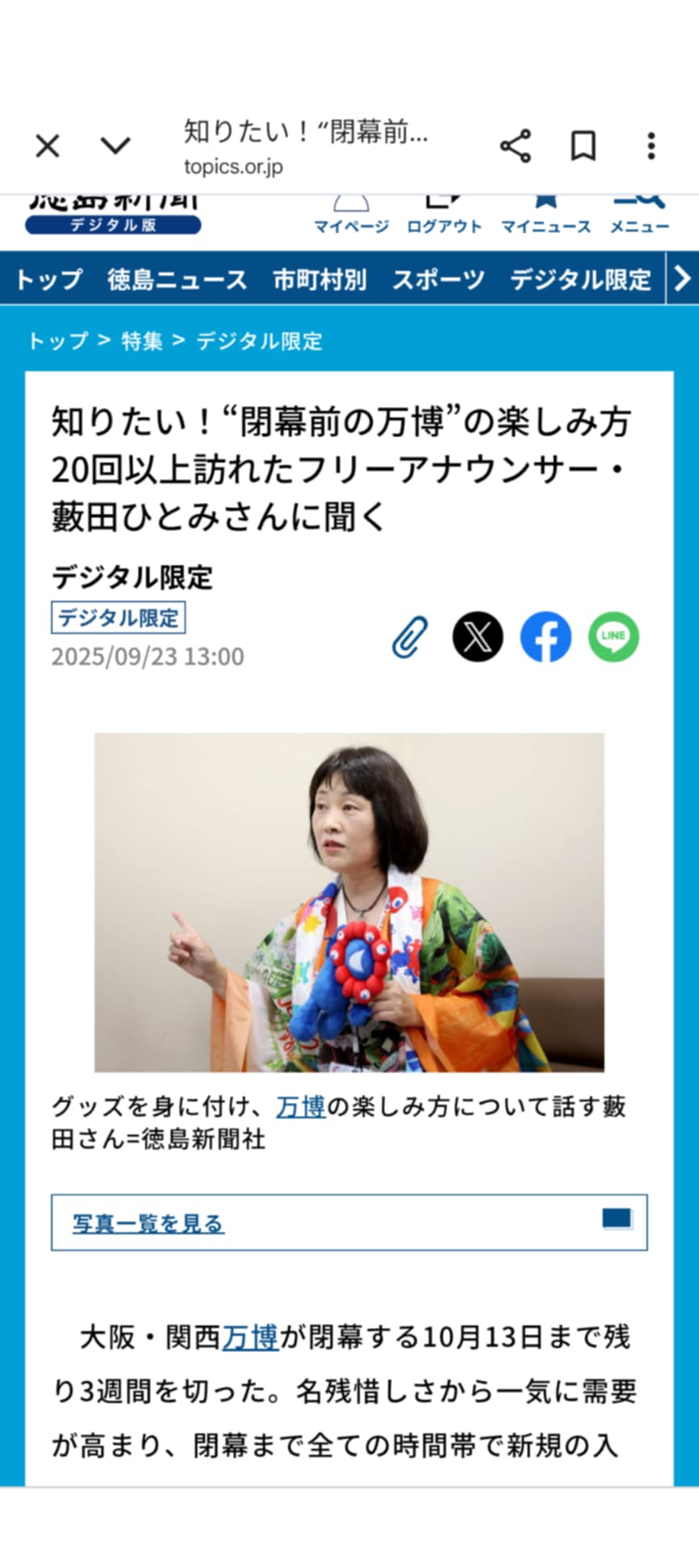 私、藪田ひとみのライフワークは国際交流活動ですとプロフィールにも記載しています。万博の話題はこのウェブサイトにのせていませんでしたが、内閣府の「世界青年の船事業」友人もいたり、行けるときには、万博に言っています。徳島新聞のデジタル版に私、藪田ひとみが大阪・関西万博に関してインタビューを受けた記事がでています。よろしければご覧ください。(会員の方が全部よめます) ブラジルパビリオンのポンチョをきて真剣にインタビューを受けているという・・・フィナーレに向け人もほんとに人も多いです。入場予約できているみなさん、全力で楽しみましょう。徳島新聞様のデジタル記事のページです。(会員登録をされた方が読めるページになっています)掲載ありがとうございます。