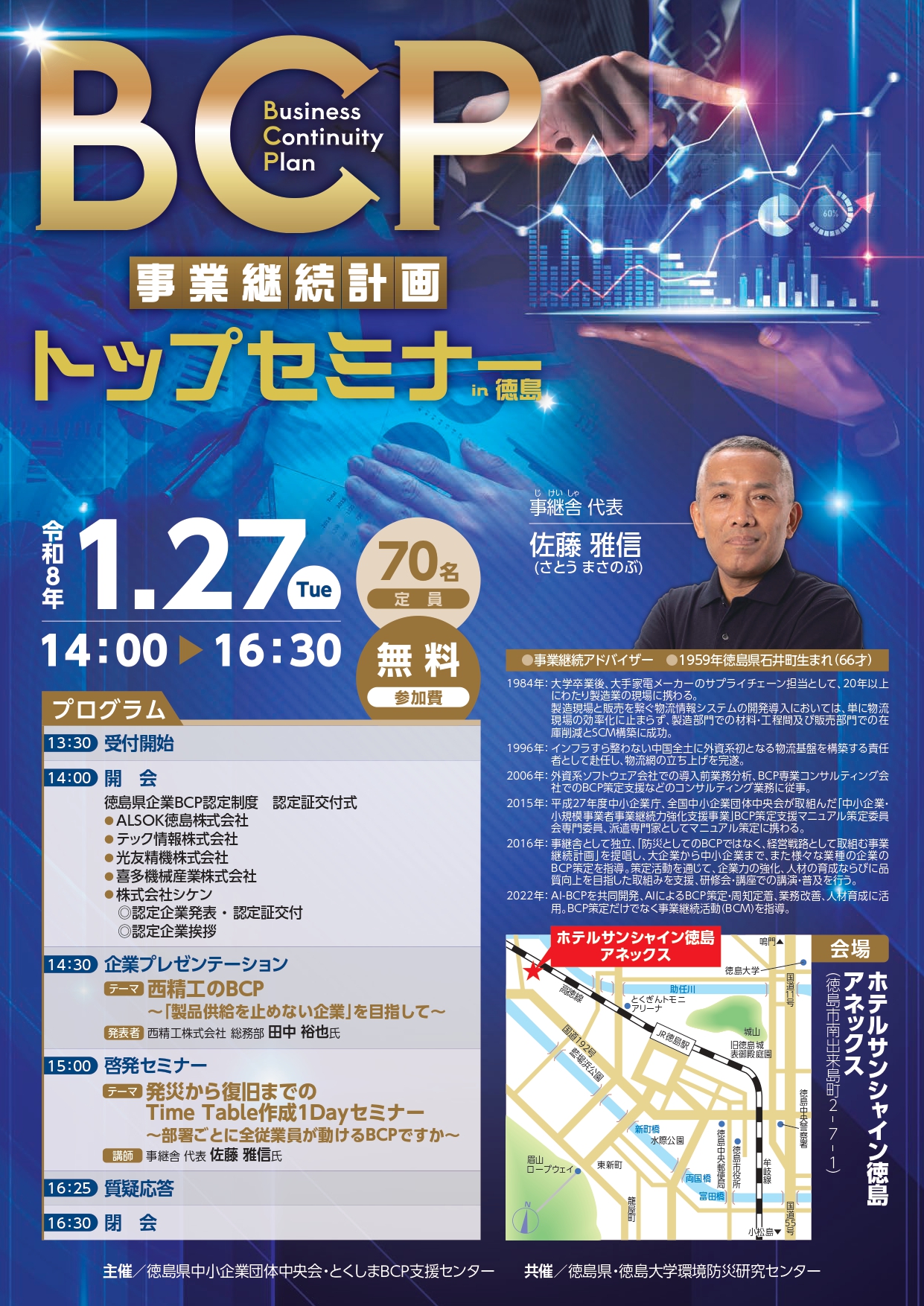 文言はチラシより抜粋いたします→「徳島県中小企業団体中央会」及び「とくしまBCP支援センター」では、「徳島県」「徳島大学環境防災研究センター」との共催により、県内企業の皆様の被害の抑制・軽減による事業継続能力の向上を図ることを目的として、平成26年度より毎年「BCP(事業継続計画)トップセミナーin徳島」を開催しております。県内企業の先進的な取り組みを知ることができる貴重な機会です。また、啓発セミナーでは、様々な業種の企業BCP策定支援を行っている事継舎代表の佐藤雅信氏に、従来のBCP策定とは違う視点からご講演いただきます。皆さまのご参加をお待ちしております。←です。